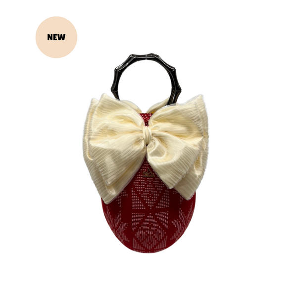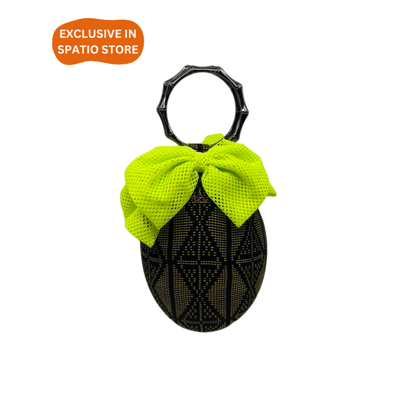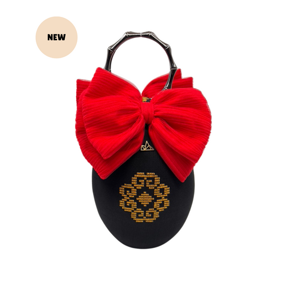 EXCLUSIVE IN SPATIO STORE. Oval-shaped bag with handwoven Mindanao Inaul fabric with soft polycotton bow on top and bamboo design gold metal handles. Can stand alone with bag foot on the bottom base.
